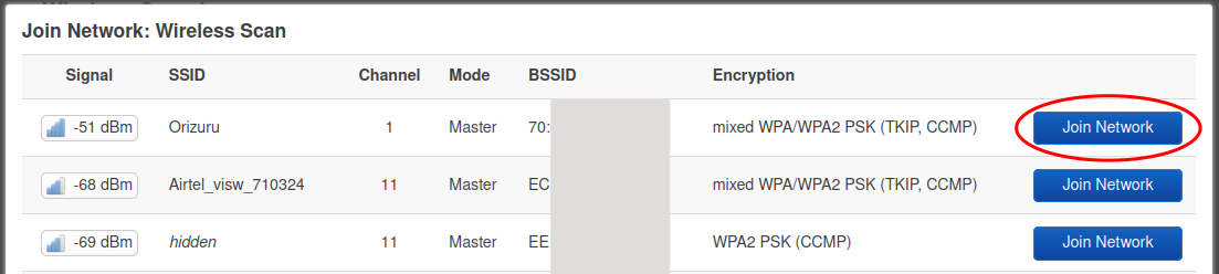 You'll see the Wireless Scan dialog. Select the network that you want to join.